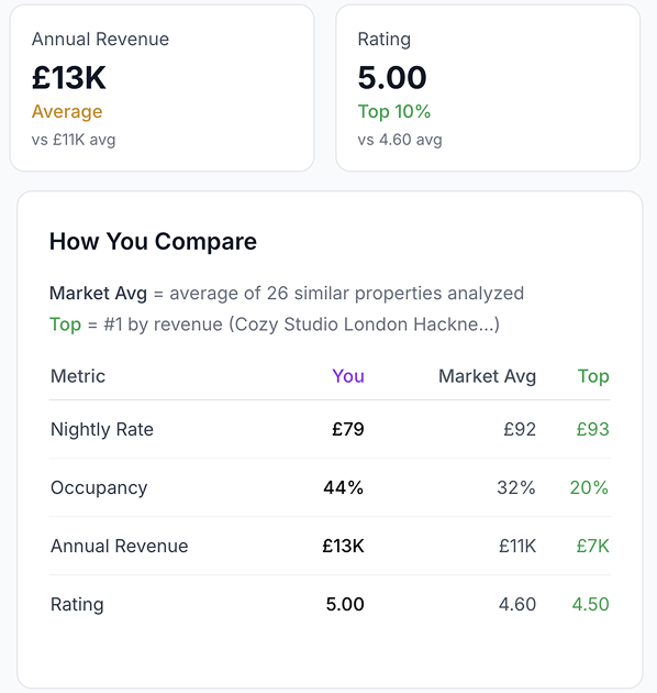 The Gap in Real Numbers: "You're $47/night below market average" is more useful than "improve your pricing."